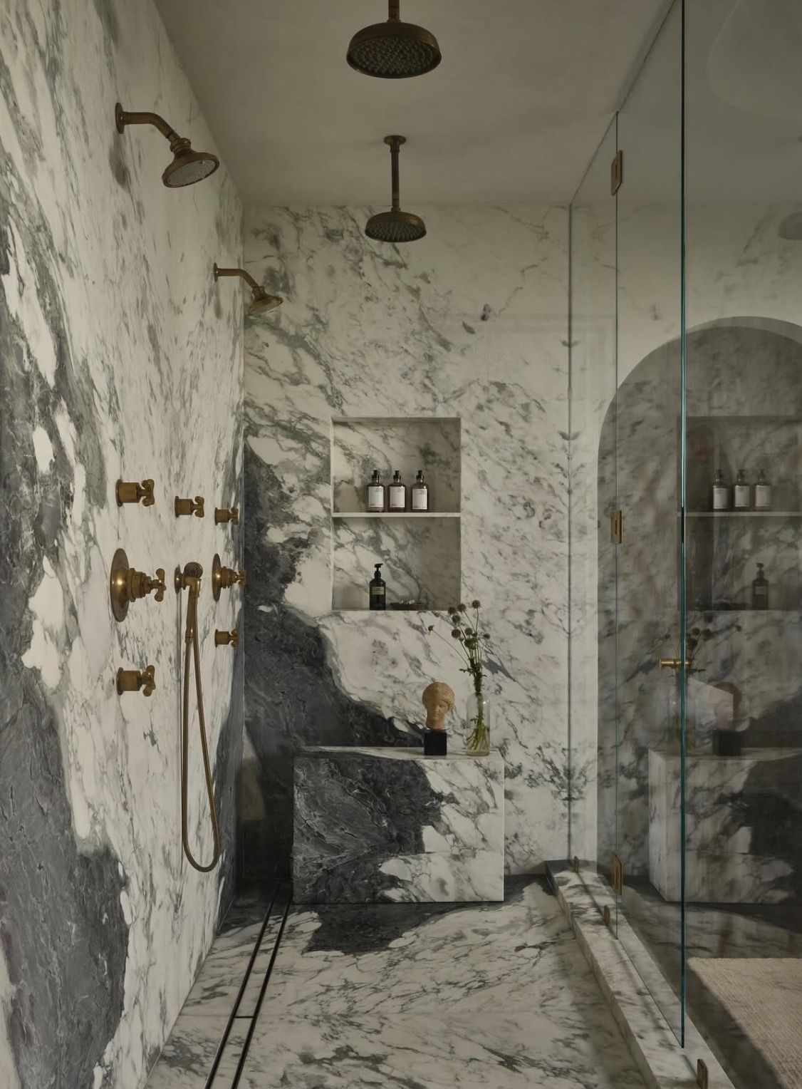 A 162 sq ft Mercer Island bath featuring white marble, gold accents, and a soft neutral palette, designed as a serene, sensory retreat that elevates daily routines into relaxing rituals.
