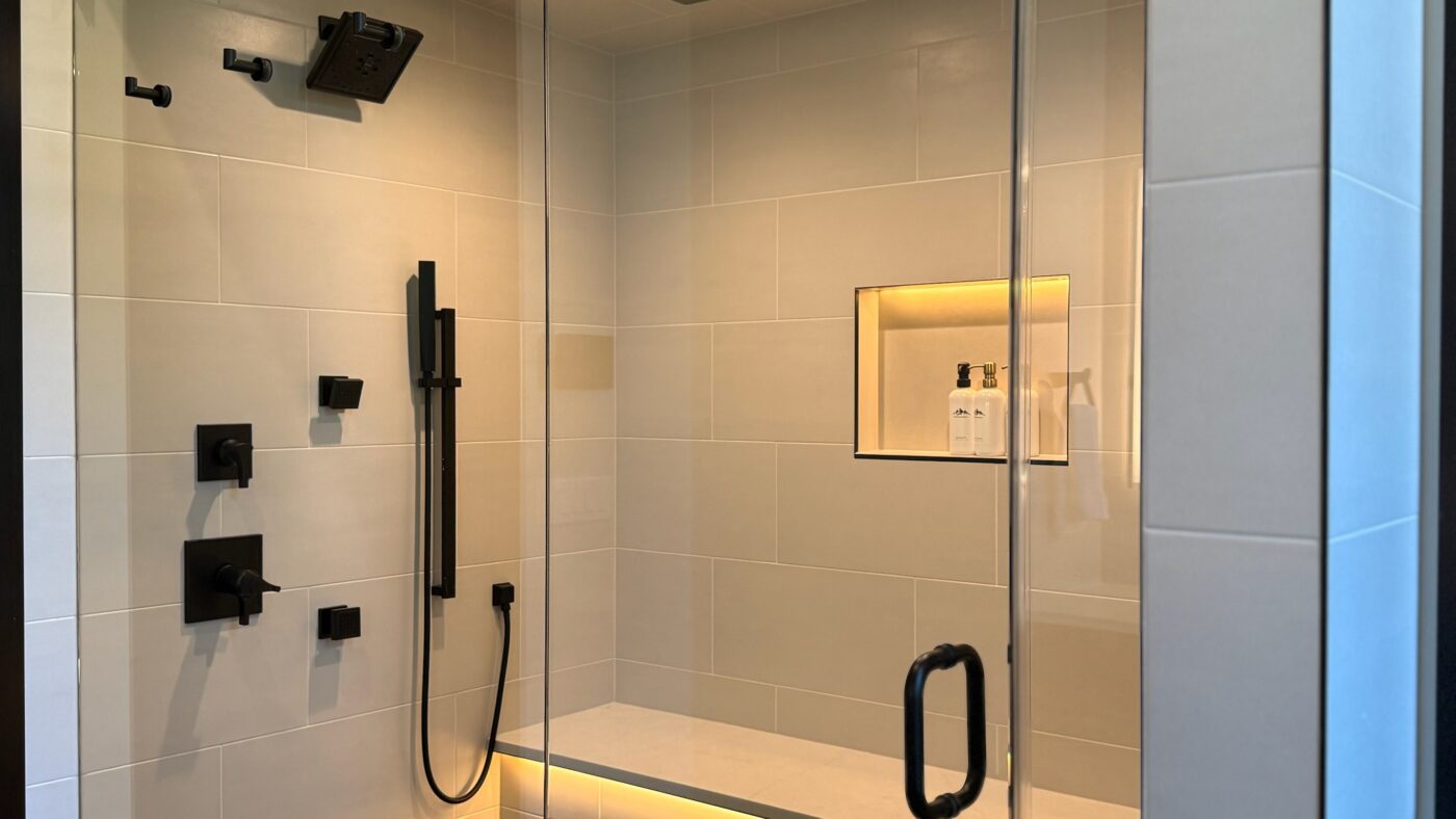 Inside the walk-in shower, form and function meet effortlessly. Light porcelain tiles line the walls, offering texture and warmth. Meanwhile, a built-in LED-lit bench adds both comfort and atmosphere. The matte black fixtures bring definition and modern contrast against the soft background. To complete the look, a recessed niche keeps essentials within reach, blending practicality with visual appeal. Together, these features make the shower both beautiful and highly functional.